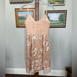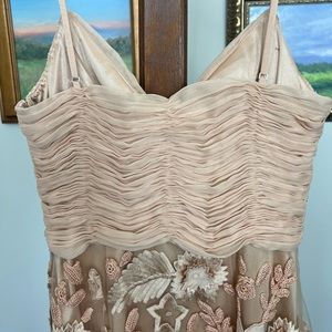 Sue Wong Cocktail Dress size 4. A beautiful champagne/blush color. Ruched chiffon bodice, embroidered and appliquéd skirt. Adjustable straps, side zip, fully lined. In excellent condition ⭐️ Bust measures 34”, length (from where strap meets the top of the dress down to the hem) 31”.