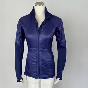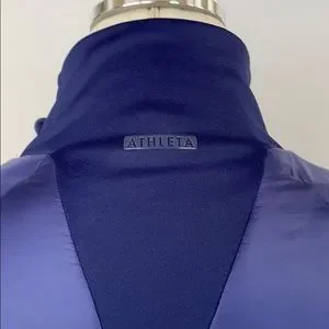 Athleta Blue Jacket Size Small Zip Front... Side Zipper Pockets & one Back zipper pocket... Stretchy Side Material For comfort…19 1/2’ laying flat pit to pit… 26’ Length… Waist 34’… Body and upper sleeve 100% Nylon .. collar, sleeve and side Panels 95% polyester 5% Spandex.. Filler 100% Polyester