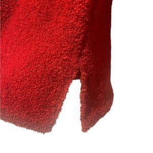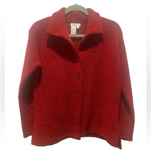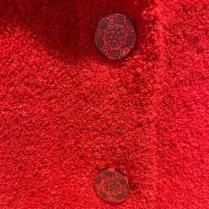 Beautiful rich red, hook knit, button front jacket. Decorative buttons. Slide slits at bottom hem. Perfect for the holidays.