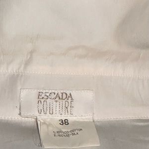 Vintage ESCADA Couture Floral Cutout Blouse. Good Condition. Slight discoloration on the middle of the collar. Thin shoulder pads beautiful sparking gold buttons. Spectacular sleeves can be cuffed or extended over the wrist. Bracelet length Sleeve with beautiful flared cuff 22 1/2”, turned up cuff 21.” Length of blouse 26.” 100% Co-Cotton, 100% Se-Silk. Size 38 (Eu).
