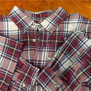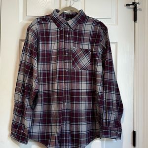 This Magellan shirt for men in size M is a classic outdoor style button-up shirt with a plaid pattern. The shirt is made of heavyweight flannel cotton, perfect for outdoor activities. The long sleeve shirt features a button-down collar and is pre-owned but in excellent condition.