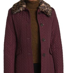 Kate Spade New York Quilted Jacket, NWT, Size XL, Color-Mulberry. A super-soft faux fur collar brings glamorous energy to this chevron quilted jacket. Removable leopard printed faux fur point collar, front button closure, 2 front flap-welt pockets. Shell-100% polyester, lining-100% polyester, faux fur collar-81% modacrylic, 19% polyester, insulation-100% polyester. Approx measurements laying flat; chest armpit to armpit 23”, sleeve inseam 17”, length 34”.