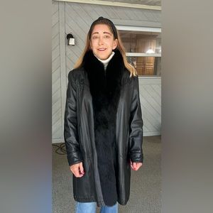 Black Lamb Leather Vintage Coat with Black Fox Tuxedo Trim. Alaskan Fur Co.
