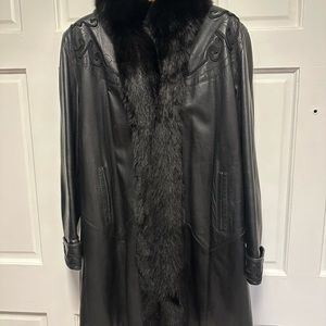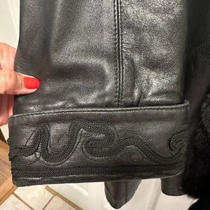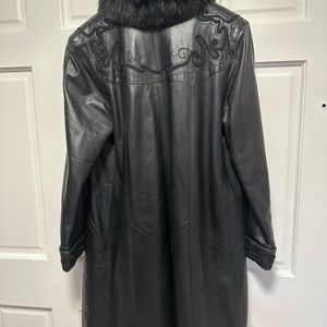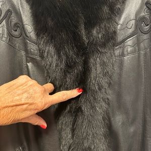 Gorgeous in mint condition. Vintage. Lamb leather soft as butter. Accent Braided trimmed stitching around shoulders’, back and cuffs on sleeves. Pockets on both sides. Black fox trim around neck and down the fronts of coat. Fully attached lining. Will fit size 4-10. Measurements listed. “A” condition. Sleeve openings have ample room for heavier sweaters. Will definitely keep you warm. Has been stored in a cool room. No need for coats now that I’m living in Florida. Purchased at Alaskan Fur in Kansas City. Monogrammed inside with “Cath” in black. Not noticeable much unless you show someone! Has a hook closure if you want to use where I’m pointing in the picture.