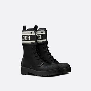 The D-Major ankle boot is offered in a military-inspired variation. The black technical fabric and calfskin laced style is embellished with a white Christian Dior embroidered band, inspired by the Dior Book Tote. The heel, round toe and thick notched rubber sole complete the design.