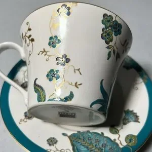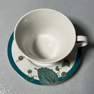 Vintage Retired Flat Cup & Saucer Set Eliza Teal by 222 FIFTH Gold Trim