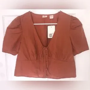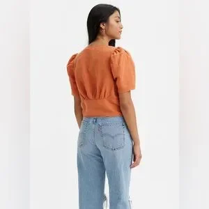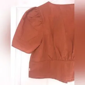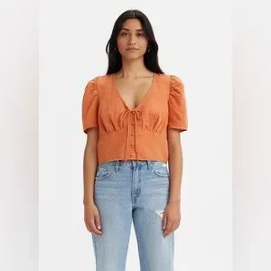 “Autumn Leaf”(orange/rust) colored Levi’s Luisa blouse. Puffed short sleeves. Deep V-neck with tie detail. Slightly cropped fit. Perfect to pair with denim! Size Medium. Made of 53% Linen, 47% Cotton. New with tags. Feel free to ask questions or make me an offer!!