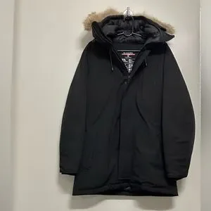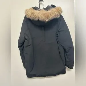 Long line winter coat with pockets and a hoodie. Hoodie with natural trim fur. Like new!