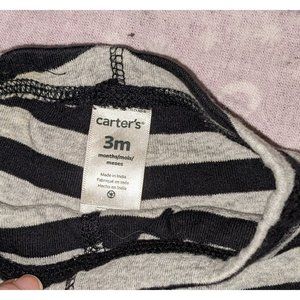 Spooky and adorable striped monster set by Carter's. They're size 3 months. The bodysuit has long sleeves and a monster face on the front. The matching pants are black and grey stripe, with black trim, and orange spikey trim on the legs. Perfect for spooky season!