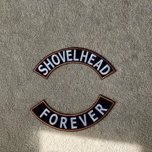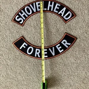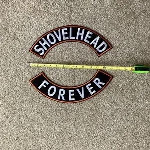 Set of Shovelhead Rocker patches for your keather vest. If you are old school Harley, you need these! Never used. Exc cond