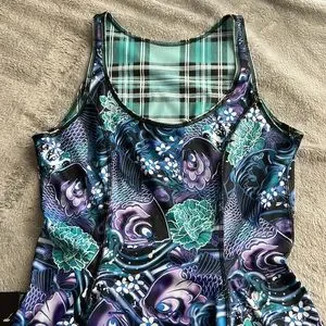 This crazy little number can be worn Tartan-side-up or Koi-side-up, whichever floats your boat at any particular moment. Change your mind about your outfit halfway through the day? Feel the? spontaneous? need for something different? Not a problem with this dress!”
