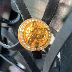 100% Leather Heel 6 inches; Platform 4 inches Gold Medusa on front Multiple straps Made in Italy