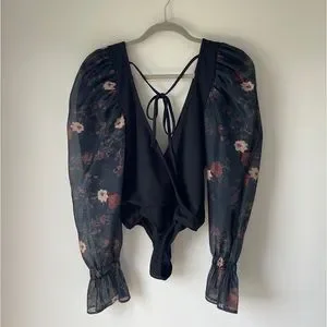 Rare! Free People Floral and Black Organza Puff Sleeve Bodysuit