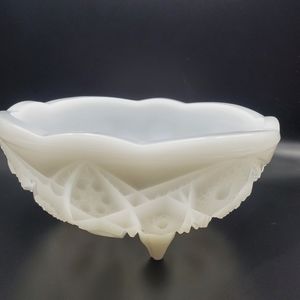 McKee Milk Glass Footed Bowl Toltec Pattern Cottagecore White Three Toed Dish 7"