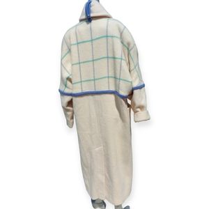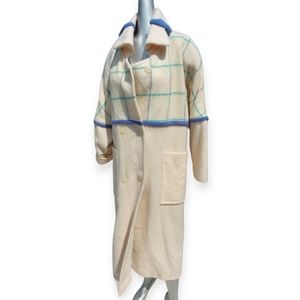 Vintage Shiff Longline Coat Deep Front pockets, Padded Shoulders Pure Virgin Wool, Made in Canada Ivory Colour, Pastel Blue+Green Dry Clean Only EUC Lining- 56% Acetate, 44% Cotton. Size states 7/8, fits like a size 8. See measurements below. *very small fluff in fabric missing* Shell- 100% Wool Sizing(approx. flat lay measurements): Pit to Pit- 22 inches Sleeve- 22 inches Length- 49.5 inches Preppy, Classy, Warm, Vintage, Winter