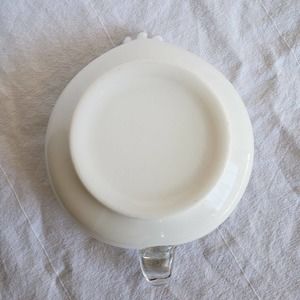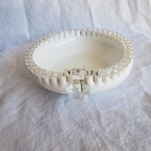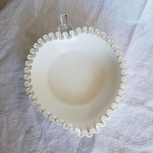 Vintage Fenton Silver Crest Heart Shaped Relish Bowl with Handle, produced from 1955-1980. This one has no marking, it would have had a foil sticker. Measures 2 inches tall, by 8 inches long, 6.5 inches wide. Overall very good vintage condition, no chips, cracks, or flea bites.