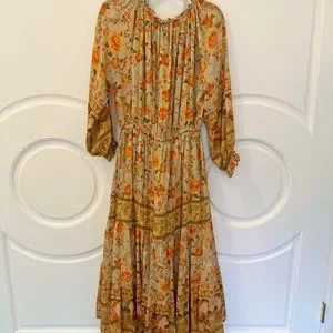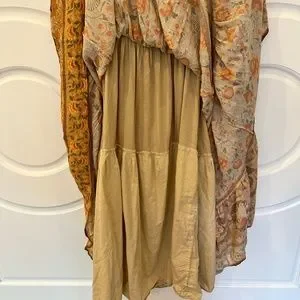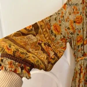 Perfect for fall! Mermaids and pumpkins (I think they are pumpkins??) and seashells....it's delightful! It has peasant sleeves that are unlined. Please note: I had my tailor make the skirt lining longer. The lining it came with felt way too short for me and I felt the dress was see through. The lining he sewed in is heavier than the lining in the rest of the dress. That adds a bit of extra warmth and weight. If you don't like it...simply cut it out and the lining will just be exactly how the dress came. This was a Free People collaboration. Very gently worn (by me). The only blemish I can find is a teeny tiny mark on the lining (pictured).