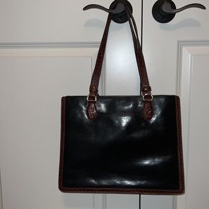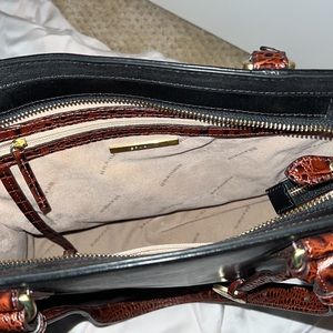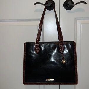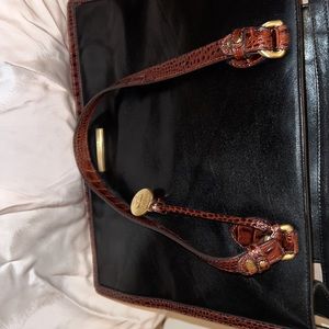 Authentic Brahmin handbag in black smooth leather & brown alligator embossed edge detail. Gold colored hardware. Only carried once. Pristine like new condition.