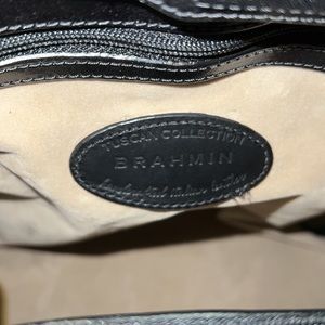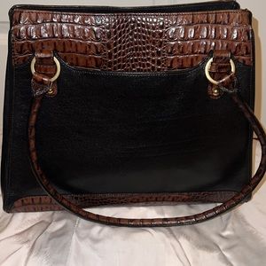 Smooth black leather & brown croc embossed leather side detail. Long loop handles for shoulder wear. Never actually used but it’s a beautiful bag. I love the contrast between the smooth black leather & the brown. Wish more Brahmin bags had that feature. I loved that pattern & bought several in different styles. 14 inch length at bottom, 11 inches in height & 4 inches wide.