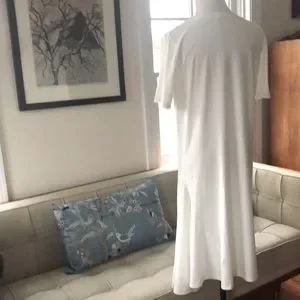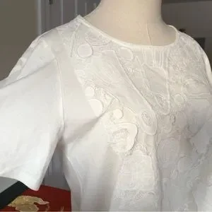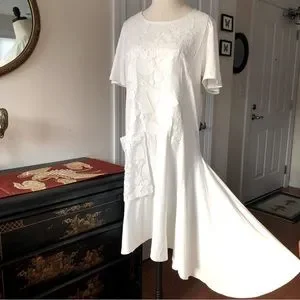 Tsumori Chisato, Iconic Japanese Designer in her early days worked at the fashion house of Issey Miyake, as is evident in her details and design. This late-vintage, artfully created white dress is 100% Cotton with Appliqué and Lace Trim made of Polyester. Features an asymmetrical hem with a voluminous panel (fanned out in first photo to show expanse) and a large front pocket. Japanese Size 2, which is equivalent to a US Size Medium, sometimes Large. I feel this dress could fit several different sizes; my dress form is a Size 2 and the dress drapes beautifully and she is not swimming in it as you might expect. Please take note that the underarm to underarm measurement is 19” across. Length is 38” and 41” at longest point. Made in Japan. EUC.