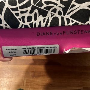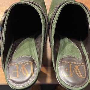 Diane Von Furstenberg Fawn Clog. Khaki green grainy nubuck chocolate vacchetta. Gorgeous DVF clog, purchase from a boutique in NY. So pretty and so perfect for fall, great condition! Size 7.5 M but fits my size 8-8.5 foot, snug. Platform 1” sole, heel height is 5”. I do have the shoebox, but unless the buyer pays additional shipping fees, it will not come with the shoes. It’s a larger box.