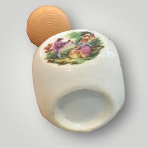 This is a lovely porcelain atomizer with a painting of the Fragonard Love Story Courting Couple Motif on each of it's four sides with gold trim accents. It's a tiny little beauty that will do justice to any vanity.