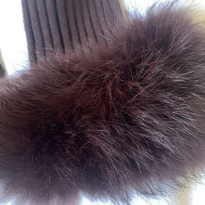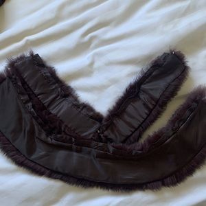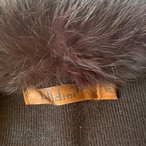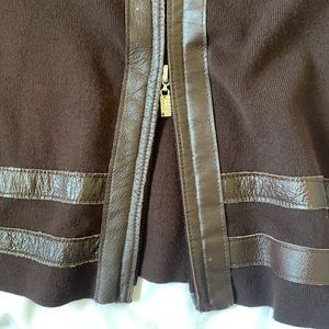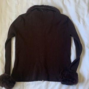 Belldini brown zip front cardigan with leather accents and button off removable natural fur collar and cuffs. Sleeves are ribbed. Armpit to armpit measures 20 inches. Length is 23 inches. 2 way zipper. Fur pieces are lined and attach securely