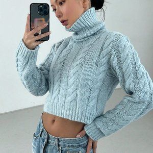 Blue Casual Womens Turtleneck Cable Knit Turtleneck Crop Sweater