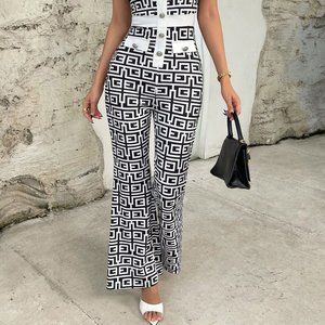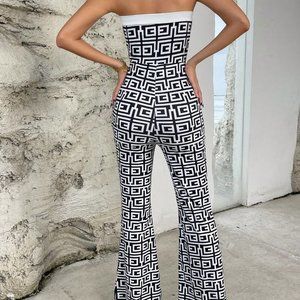 White & Black Preppy Womens Geo Print Button Front Tube Jumpsuit