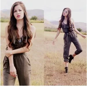 Spaghetti strap tank top. Adjustable straps. Surpluses wrap top. Top can be worn with deep v plunge or closed with Eye hook and thread at chest. Elastic waist sits high at natural waist. Removable tie bow belt.