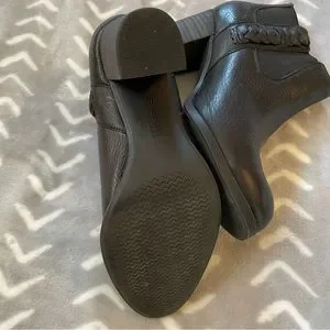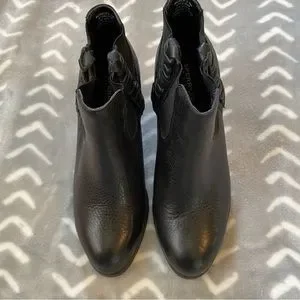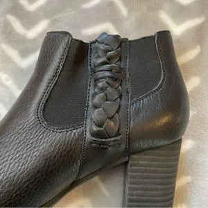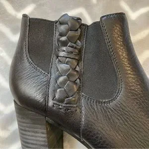 These are truly the cutest boots with leather braided detailing on the sides. The heels are about 3” tall at the back. Only worn twice because I can’t wear heels (😭😭😭) so they’re in very good condition. Only a couple light scuffs on the heels. Check out pics for more info.