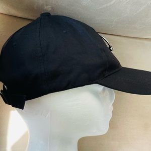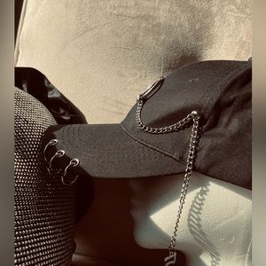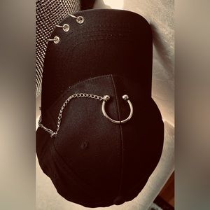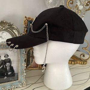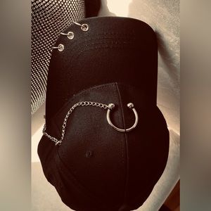 Black Ball Cap hat with silver piercings and a Large pierce ring attached to a hanging chain and adjustable buckle back. This is a very coolio and Adjustable unisex hat.