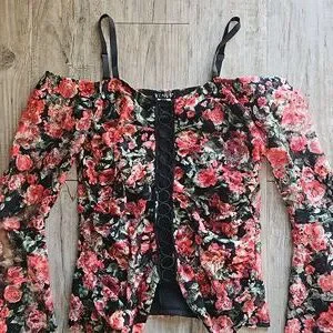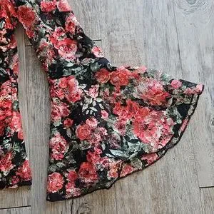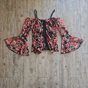 Gorgeous floral lace blouse with big bell sleeves. Straps are adjustable. Top has black underlay. Sleeves are lace and off the shoulder. Cute detail down front.