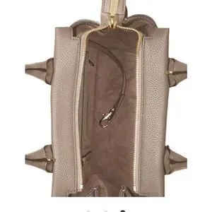 Looped and rolled double handles make a ladylike statement on a suede-lined satchel suspended from a bonus strap.