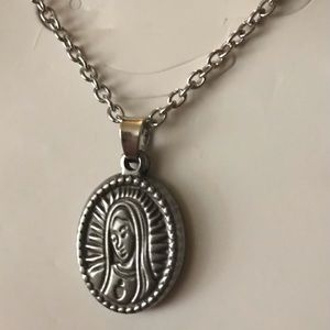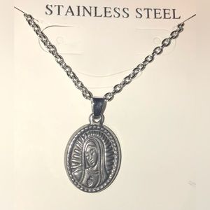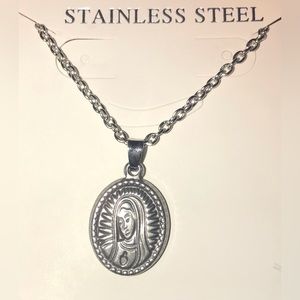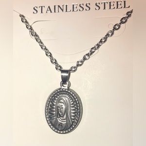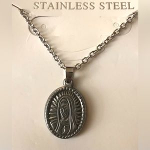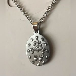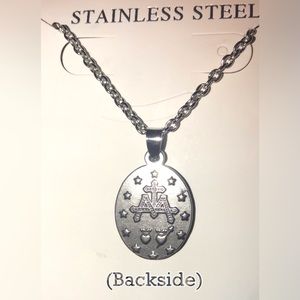 On the back, the large letter "M" = Mary as Mother, Mediatrix (mediator/intercessor). Cross and bar = Jesus' Cross of Redemption for mankind. The interlacing of the M and the Cross shows Mary’s close involvement with Jesus & role as Mediatrix. 12 stars – the Twelve Apostles and the vision of St. John in Revelation 12:1: "And a great sign appeared in heaven: A woman clothed with the sun, and the moon under her feet, and on her head a crown of twelve stars." Left Heart – The Sacred Heart of Jesus. Right Heart – The Immaculate Heart of Mary. Flames above both hearts – The burning love both Jesus and Mary have for all people. On a link chain. Stainless Steel. Anti-tarnish! Hypoallergenic. Lead & nickel free. New.