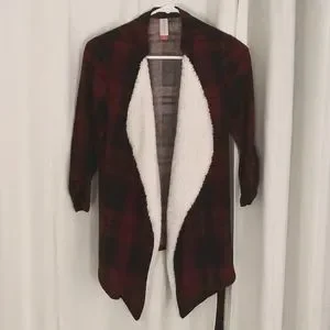 EUC, No Boundaries brand red burgundy and black plaid cardigan with white faux sherpa on front