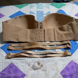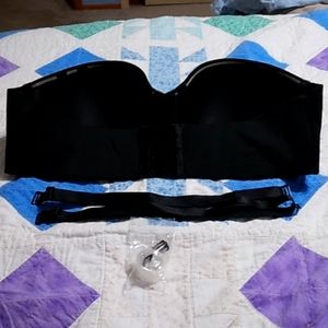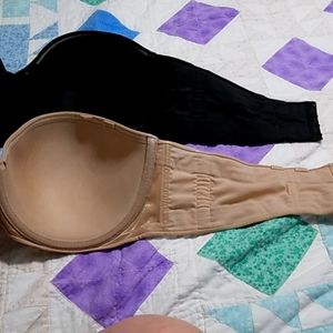 1 black strapless bra size 42C which also includes 1 set of black adjustable straps and 1 set of clear adjustable straps with black hooks. 1 beige strapless bra size 42C which also includes 2 sets of beige straps 1 set is more shimmery and 1 set of clear adjustable straps with beige hooks. Plus 1 bonus set of clear adjustable straps with white hooks. The straps can be worn in many ways. Regular, X back, 1 across. The bras have across the top of the cups on the inside a grip material. These have never been worn. They were originally $54 EACH.
