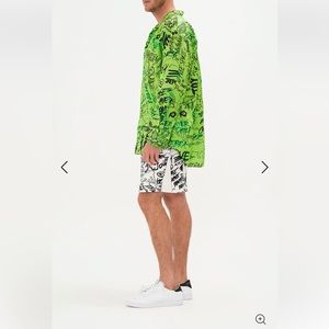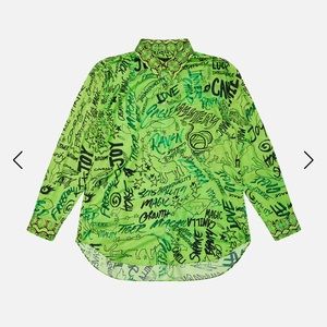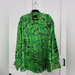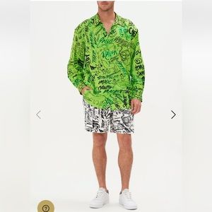 The Anti Authority Animal Authorities Mens Oversized Shirt captures the imagination with an electric green graffiti print complete with swirls of black star detailing, slogan splashes and fiery hand-illustrations. Crafted to blur the lines between casual and occasion, this luxury men’s silk shirt sports a structured collar, a curved hemline and yoking upon the back that leads into a relaxed oversized silhouette.
