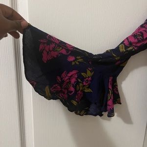 Express fashion Navy and fuchsia banded peasant top with bell sleeves and crochet detailing on the shoulders.