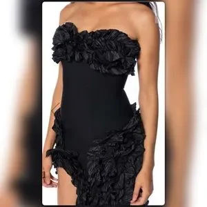 Pump it up! The AKIRA Label Dont Stop The Party Strapless Ruffle Fringe Mini Dress is made from a stretchy bandage knit fabrication base and features a strapless neckline, padded cups, a mini length silhouette, and a tonal back zipper closure. Complete with pleated ruffle trim across the chest and coordinating, extended ruffle trim along the hem.