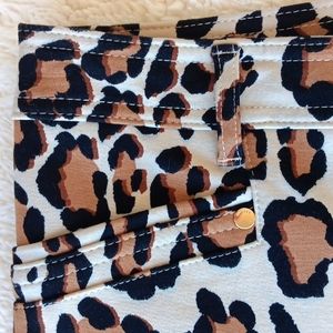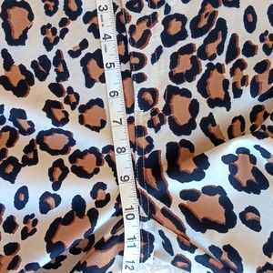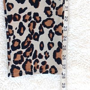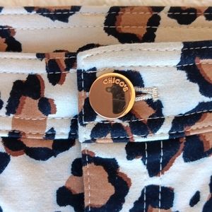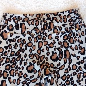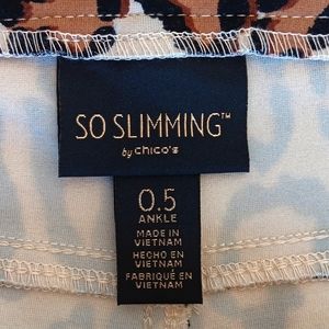 Chico's So Slimming leopard knit skinny ankle pants, Chico's vanity size 0.5. Has front zipper closure, two faux front pockets, two back pockets, and gold tone hardware. Measures approximately 28" inseam, waist 15 3/4" flat across, rise 10 1/4". Pre-owned and in very good condition.