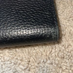 A few scuffs/signs of wear on the black leather. Otherwise in gently used condition! Pretty light pink leather, inside fabric design is purple with different shades of pink!