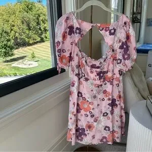 Details Style No. 46458790 ; Color Code: 055 Retro-inspired floral printed dress featured in a super mini silhouette. Shirred detailing along the bodice Open back detail Tie detailing on the neckline and sleeve cuffs Hidden side zip closure Unlined Care/Import Dry Clean Import Measurements for size small Bust: 29 in Length: 29.5 in Sleeve Length: 8.5 in Contents 35% Viscose 65% Rayon