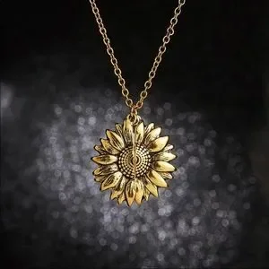 This is a super cute necklace to give to a very special person in your life! It is a antiqued gold color looking sunflower on the exterior and has the message “You are my sunshine” in a silver tone on the inside! Special!
