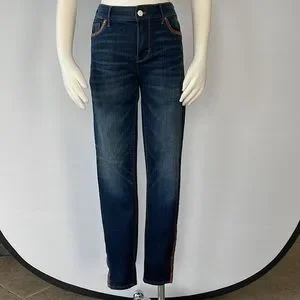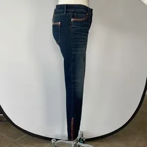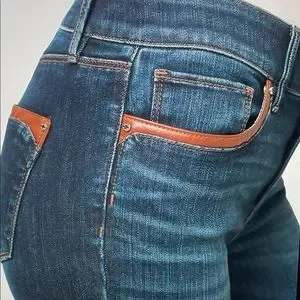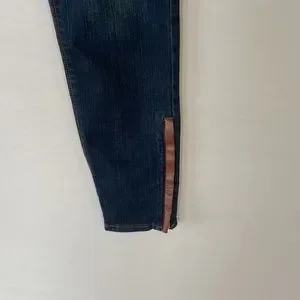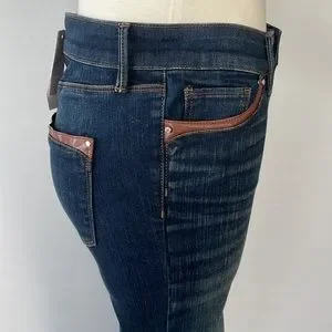 NWT WHBM Mid Rise Skinny Ankle Jeans… Size 2…Dark Wash…Faux Brown Leather Trim pockets and at Ankle… Zipper Ankle… Stretch.. 68% Cotton 18% Rayon 12% Polyester 2%Spandex… Machine Wash… Inseam 28’ Midrise 9 1/2… 29 1/2’ Waist.. 38’ Length