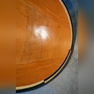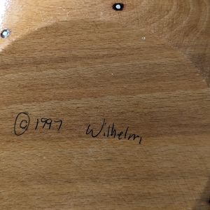 Hand carved and painted wooden serving bowl by Robert Wilhelm. Signed 1997. Bowl is in very good pre-owned vintage condition. Minimal scuffs what does not take beauty of bowl. 10 3/4"-10"- 3"