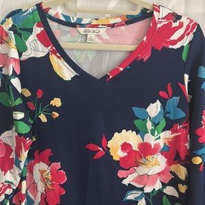 The Pioneer Woman, V Neck, Navy Floral Print Top, Size Small. Measures 18 1/2 inches from armpit to armpit, 24 1/2 inches from shoulder to hem. In great condition.