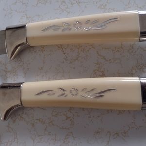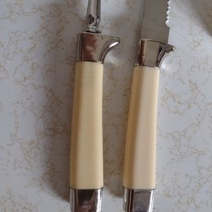 Regent Sheffield knife and fork serving set. VTG. Stainless Steel. In Box. Preloved? White Handled. MCM. Inside box has slight water marks. Cutlery. celluloid handles.