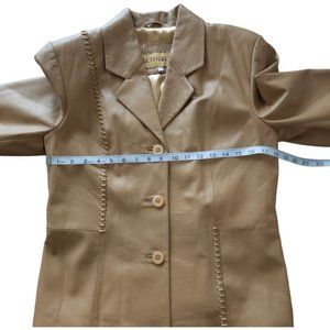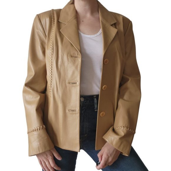 - light brown leather with accents on seams - single breasted - three button closure - fitted style size: marked XL, but I think it sits smaller. measurements in photos. Condition: very good. no stains or holes. The "threading" detail are capable of coming out on the ends but it is fairly easy on insert it back in.