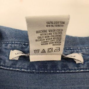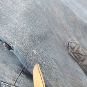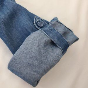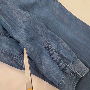 Excellent condition. Does have a white spot on the sleeve that I looks like a fabric coloring flaw, not a bleach stain or the like. It was hidden by the rolled up sleeve and noticed when I was folding. This is a lightweight blouse and the tencel fabric adds a light sheen to the denim look. Super cute top!